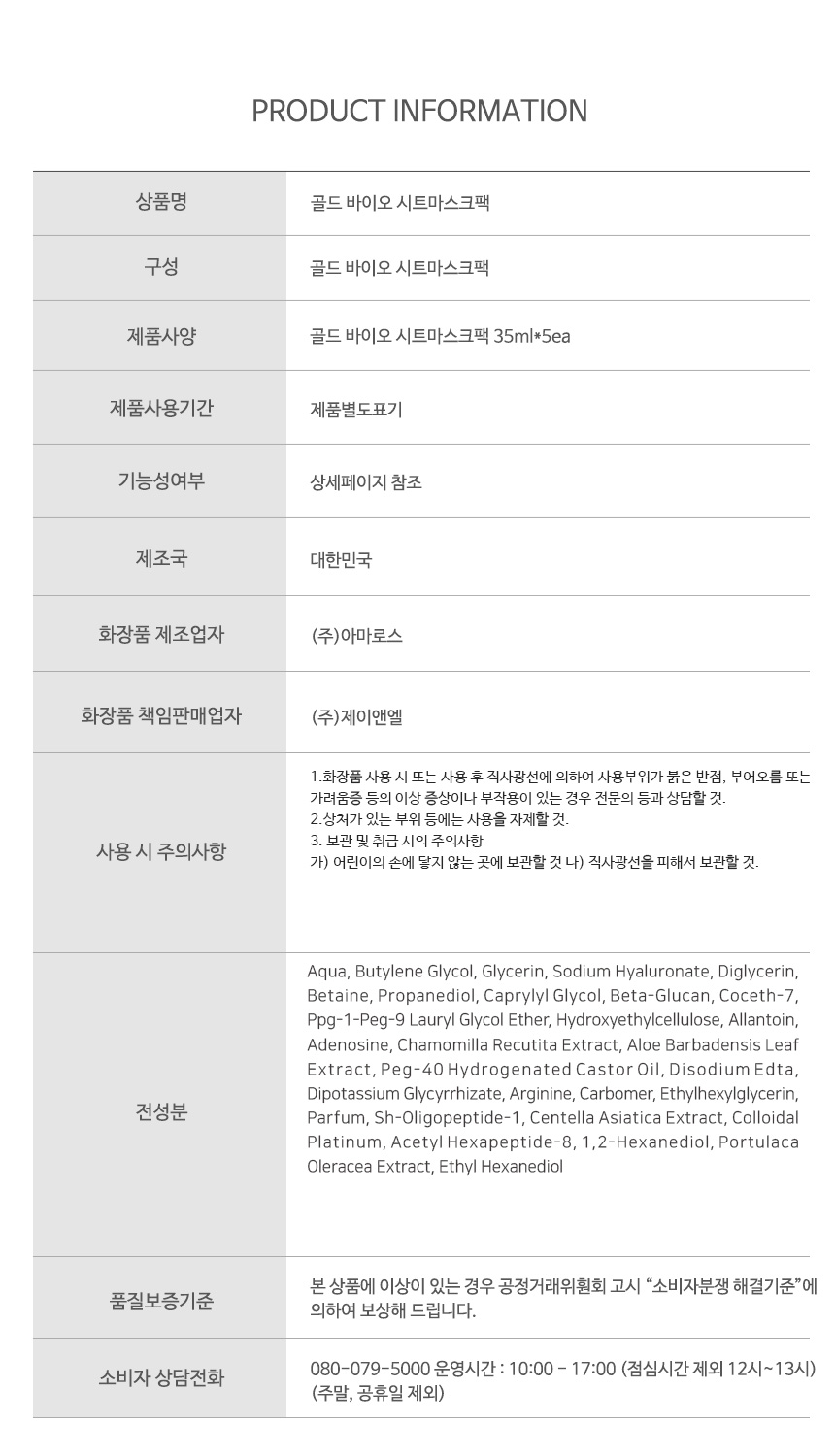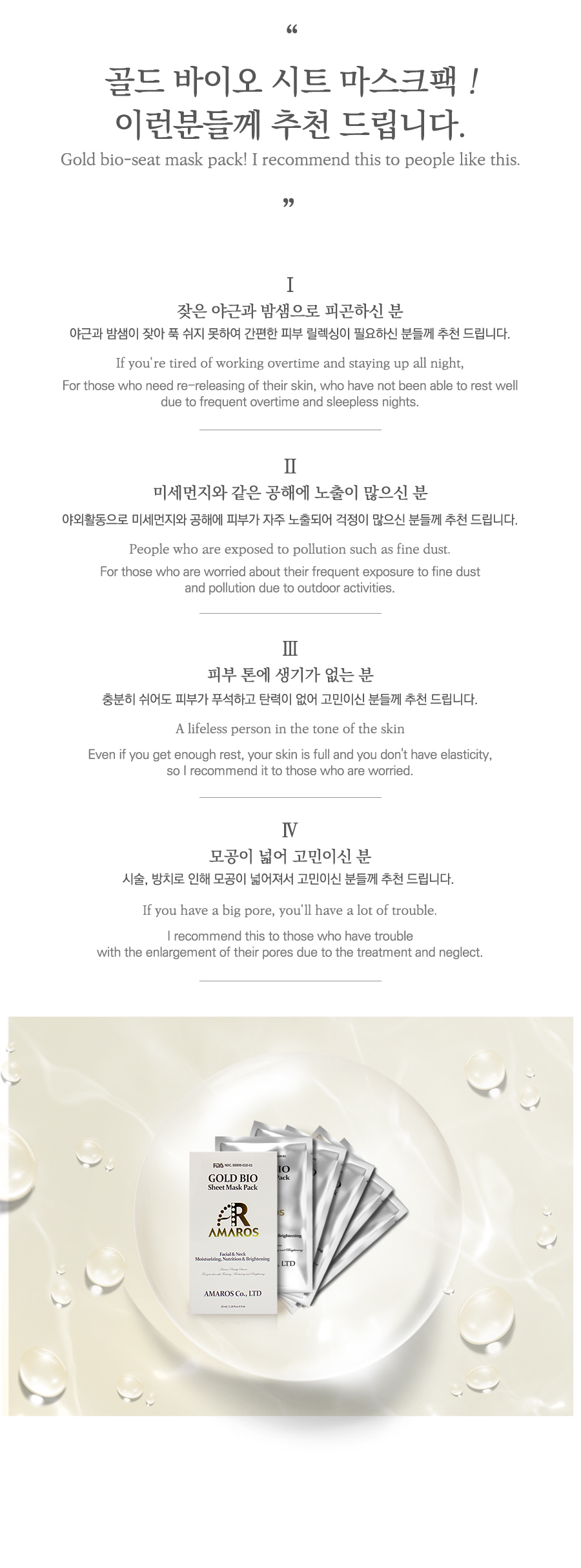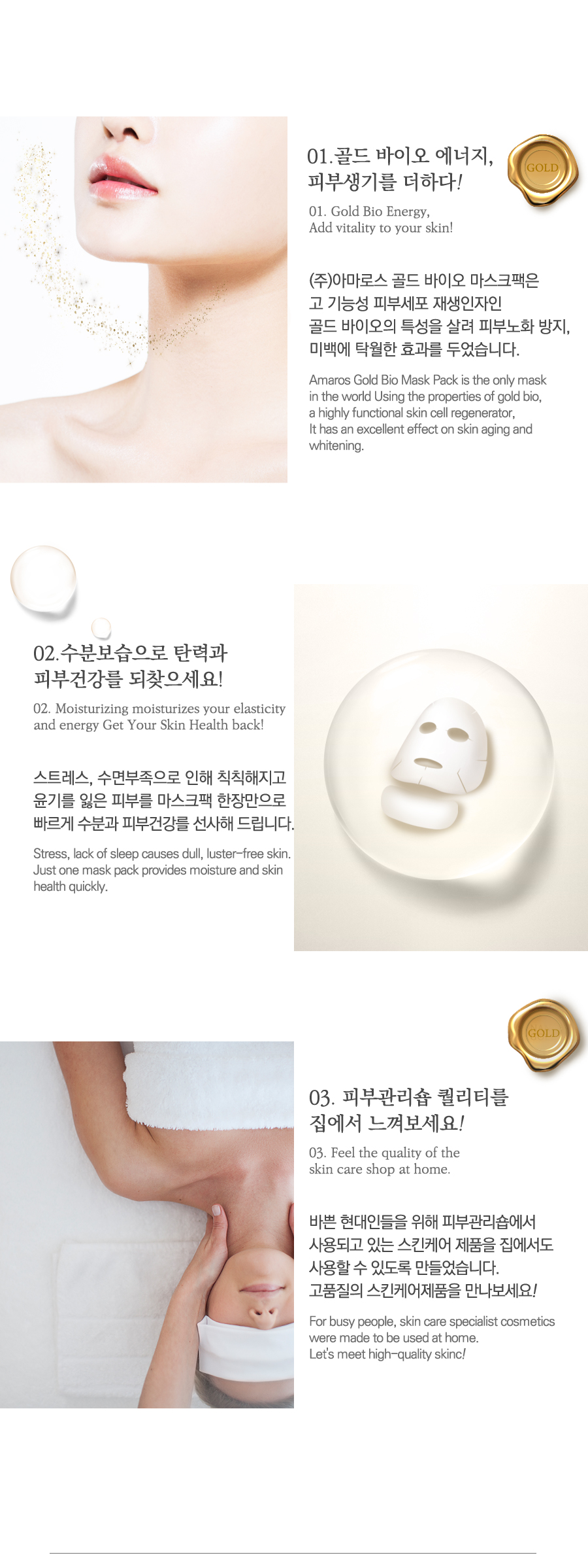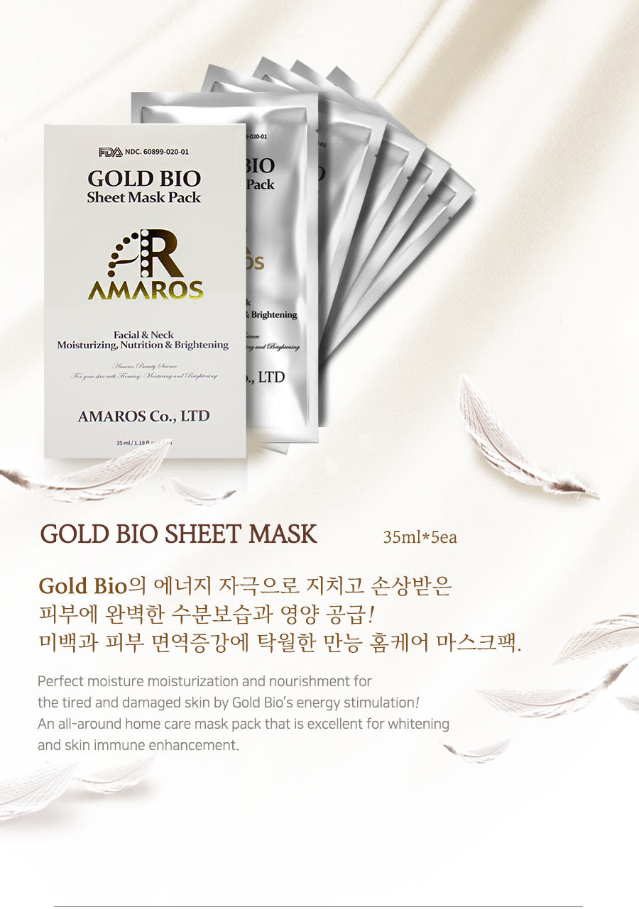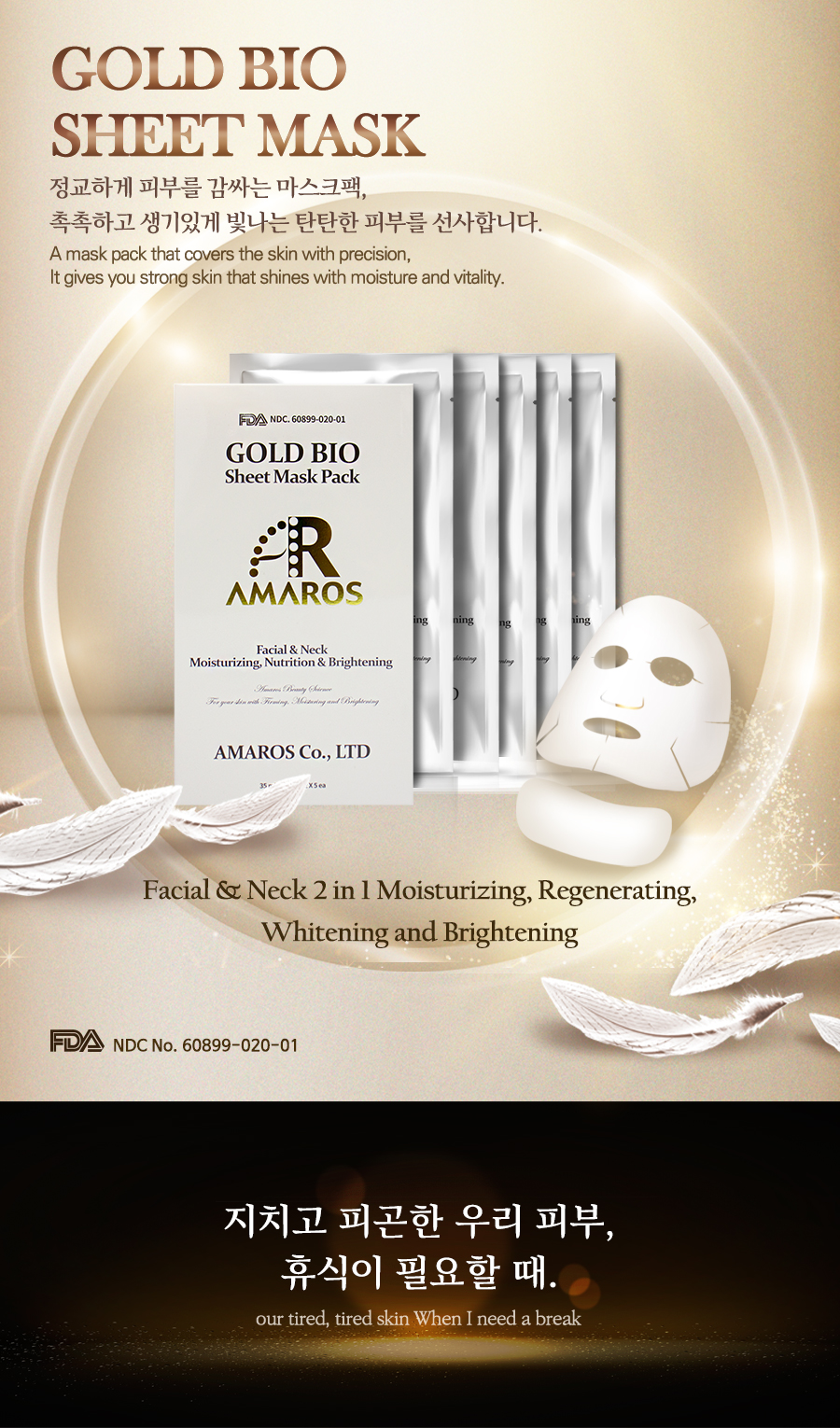 골드 바이오 시트마스크팩 -기능성 피부세포 재생인자와 나노 골드의 성분으로 재생을 촉진해 얼굴과 턱선 목까지 빠른진정과 회복을 느낄수있습니다.