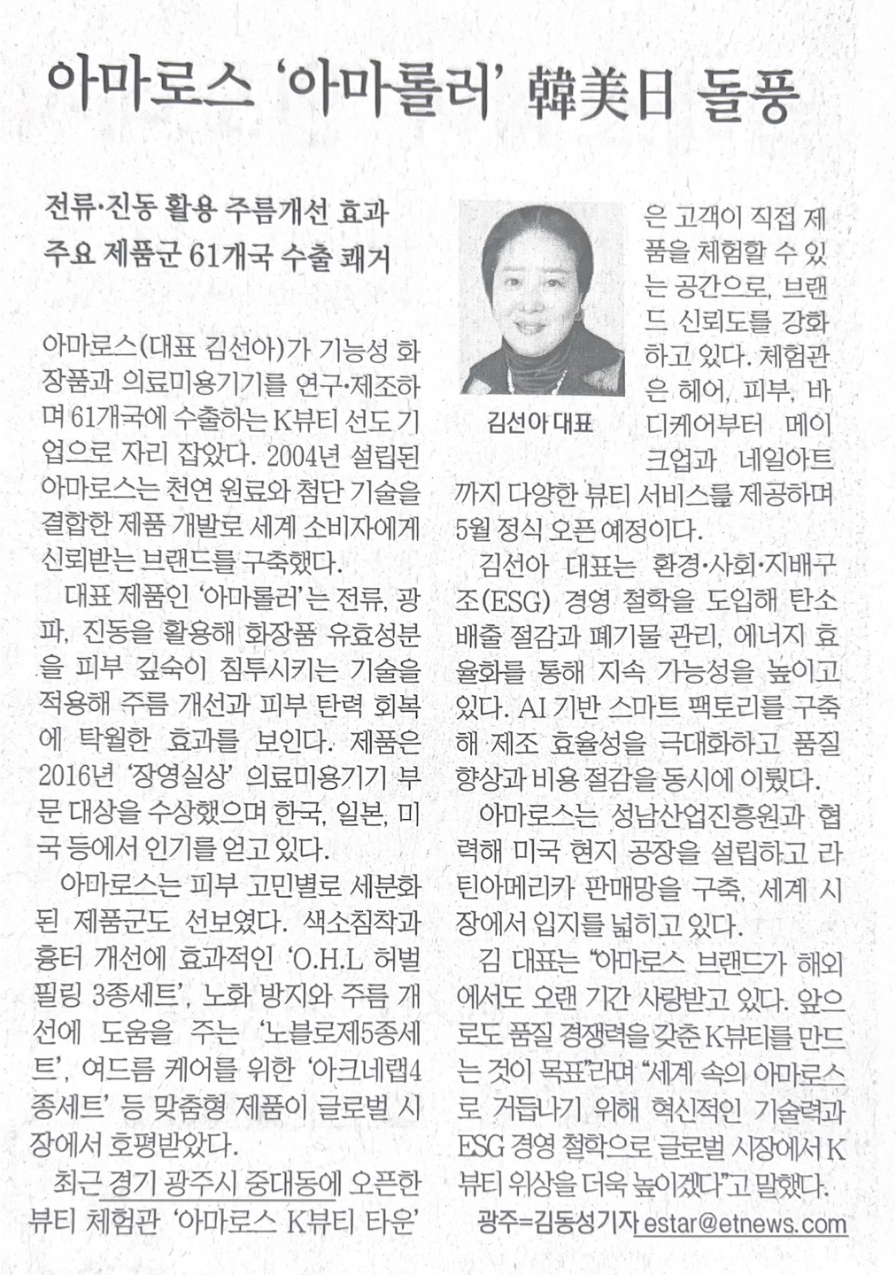 [전자신문] 전류 • 진동 활용 주름개선 효과 주요 제품군 61개국 수출 쾌거